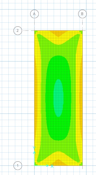 Our work to complete this assignment was performed by William A. Yanko, Ph.D., P.E. Dr. Yanko reviewed permit documents, structural drawings, and performed a thorough site inspection. He also performed several hand calculations and computer generated models to assess the expected performance of the concrete slabs. U.S. Forensic generated several different computer simulations for assessing the slab design to determine the anticipated deflection, code-required rebar, and expected crack pattern. This type of system can normally be designed using hand calculations. However, our generation of a computer model was intended to simulate the field conditions more precisely and provide the client (who possibly does not have an engineering education) with graphical images that were more easily understandable. The software utilized a 3-D finite element analysis with the walls and floor modeled with properties indicative of those specified in the structural drawings. Live and dead service loads were applied to slab surfaces in the models. The pattern of cracking observed in the field and within the models conformed to what was expected from basic engineering mechanics for this type of system. The crack pattern was clearly consistent with what is commonly known as yield line theory, where cracks form at maximum flexural moment locations (hinges). Yield line theory is not a new methodology for examining slabs (first presented in the early 1920’s and applied to concrete slabs in the early 1960’s). The theory is commonly presented in an introductory concrete design class (normally in the junior year of an undergraduate engineering education). However, simple field examples such as these remind engineers that inclusion of basic theories is important in an engineering education. Furthermore, a computer is likely not available for usage during field inspections. Diagnosis of a problem is often based solely on the expertise of the investigator, not the output from a computer model. Dr. Yanko’s findings were as follows:
