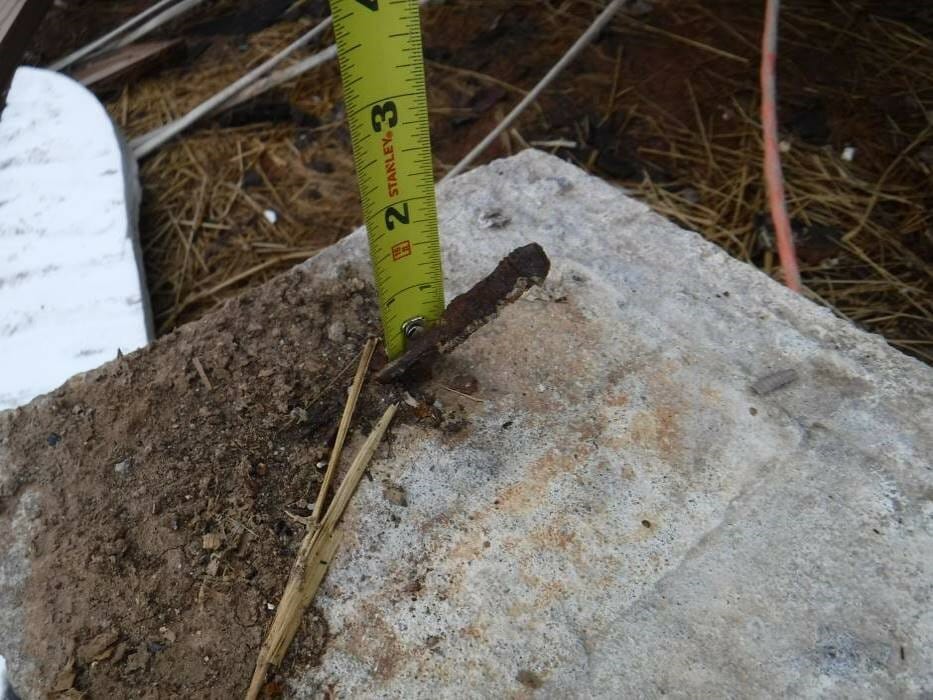 - View of a metal anchor embedded in the bottom of a post and detached from the foundation.