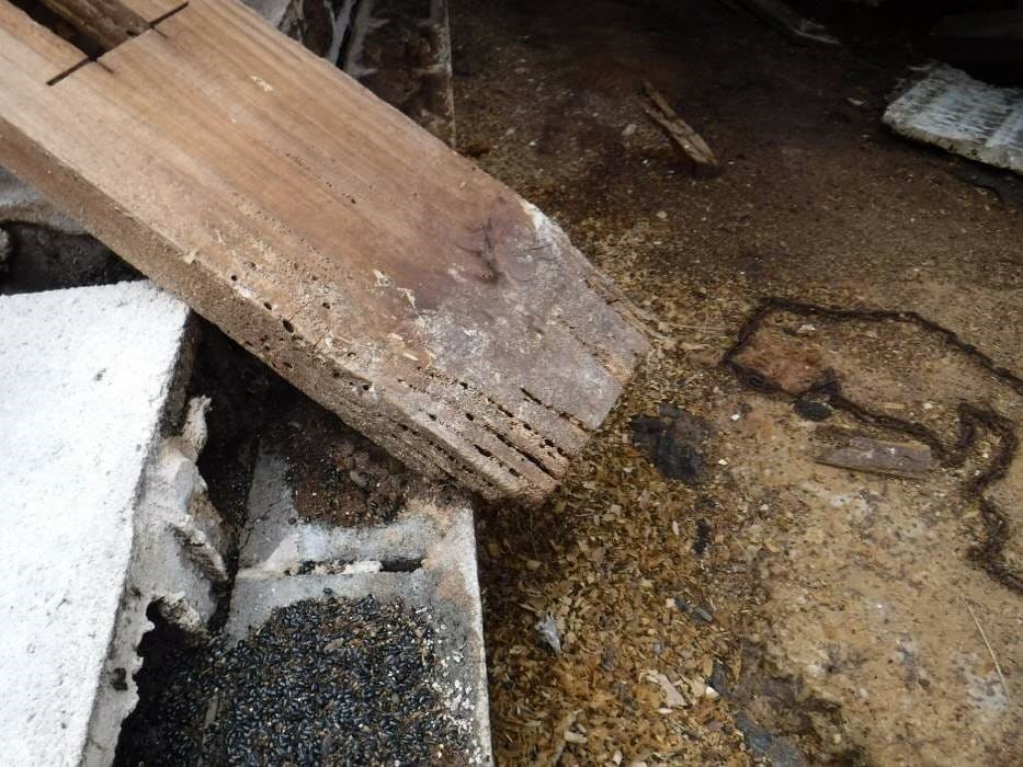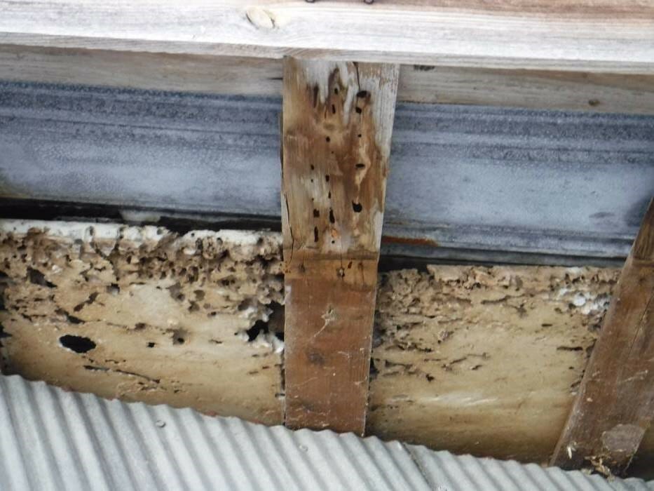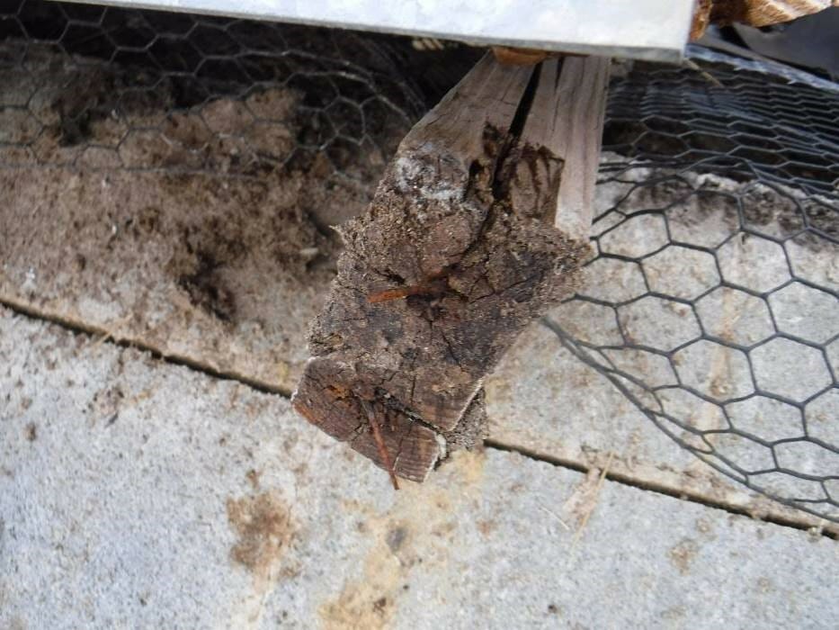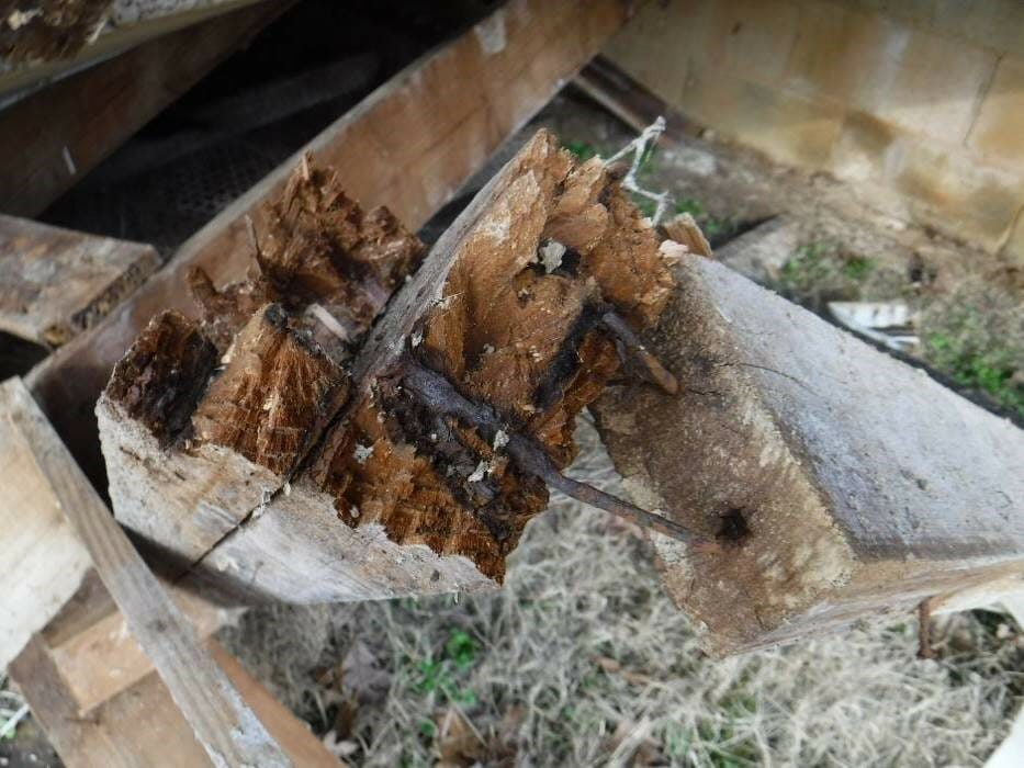 Visual inspection of the accessible wood framing at the collapsed barn area revealed there were localized areas where the wood had experienced section loss consistent with insect exposure. The metal anchors observed at the 2 foundation supports and along the north wall were heavily discolored and had experienced section loss. We noted lengthy areas where the sill plate was not connected to the supporting block wall.