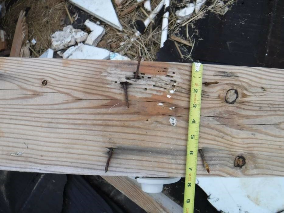 The wind load from the north direction would have caused the barn to lean slightly in the south direction and with the snow load on the roof, this created an eccentric loading condition for the posts and the lightly braced barn structure, called a P-delta effect, which led to the collapse of the barn. The majority of the wood framing beneath the metal roof covering was not accessible. However, we noted localized section loss to the wood, consistent with insect exposure, discoloration and section loss to nail fasteners and post and wall anchors consistent with corrosion, and lengthy areas along the north foundation wall, where there was no mechanical connection between the stud wall framing and the supporting block wall. The barn building collapsed due to the deteriorated condition and substandard construction of the framing that was exposed and overcome by the heavy snowfall in combination with minor wind pressures.