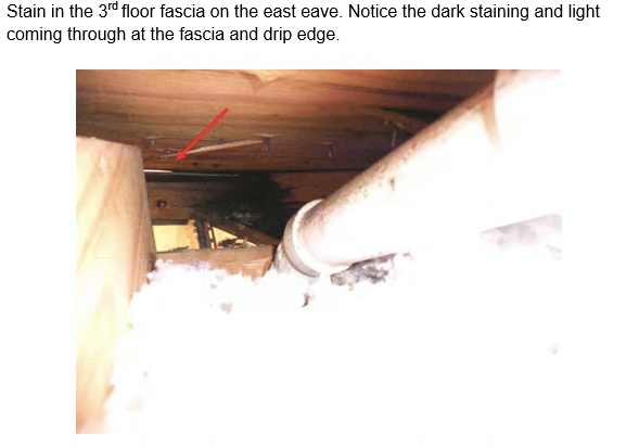 The shingles along the eaves of the roof were cut short of the drip edge. In the attic above the third floor master bathroom light could be seen at the eave. This was consistent with shingles being cut short. To the south the fascia wood was stained consistent with water intrusion at the eave.